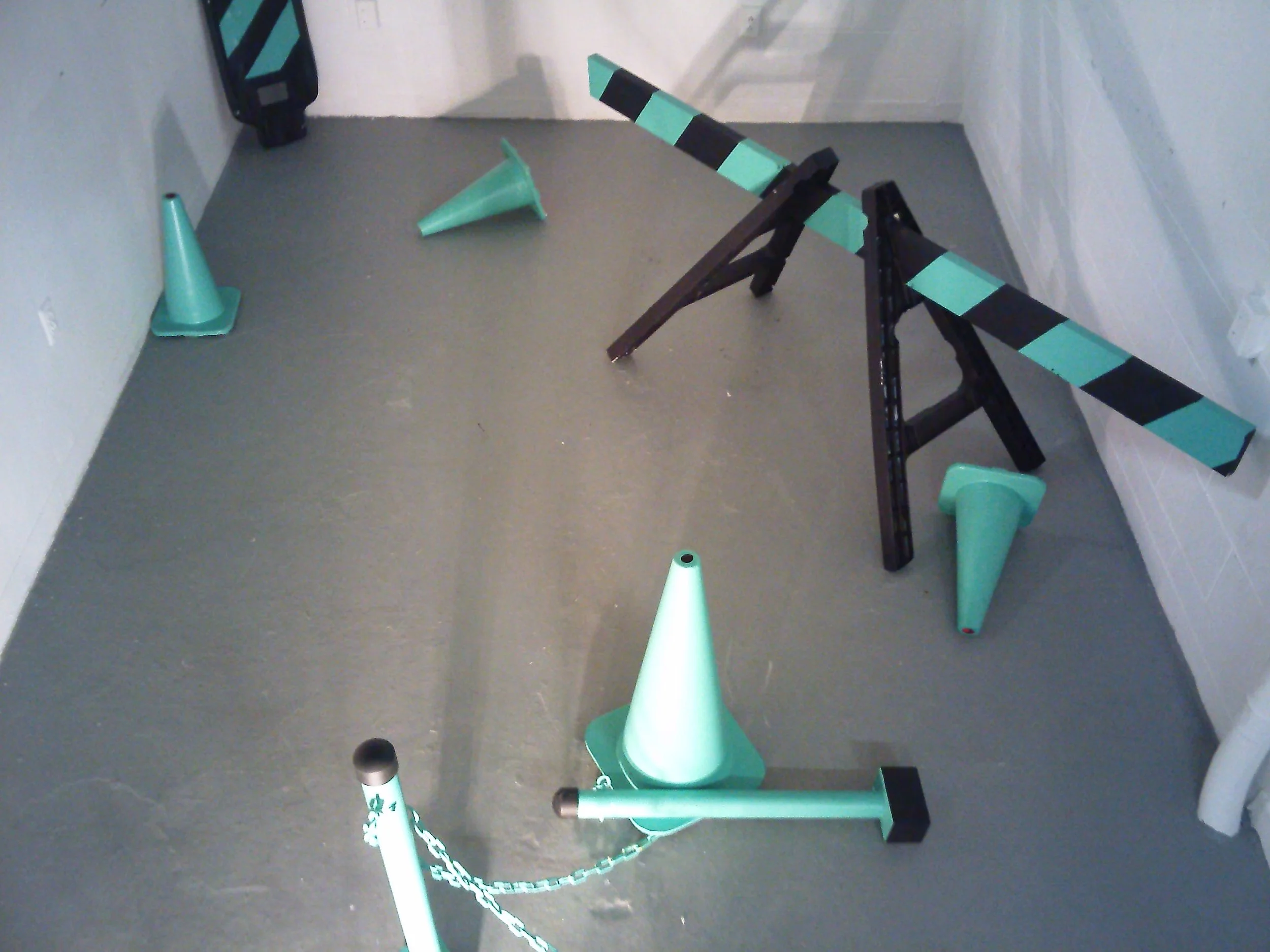 In a series of recorded actions within central Pennsylvania, I utilize paint, pulleys, stage lighting, floating platforms, roadblocks, mirrors, and projections to challenge narratives of death and birth. Vault is both a verb for leaping or pushing upward and a noun for a secure room where valuables are safely kept. VE1 documents my dizzying to the point of nearly passing out and then attempting to navigate a “burial chamber” filled with traffic barricades. My incorporation of teal-turquoise is reminiscent of a color traditionally used to protect the body and soul.